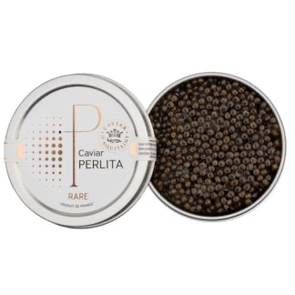 Perlita-kaviaar kenmerkt zich door opmerkelijke, verfijnde korrels met kleurschakeringen van grijs tot lichtbruin, subtiel geaccentueerd met goudtinten.